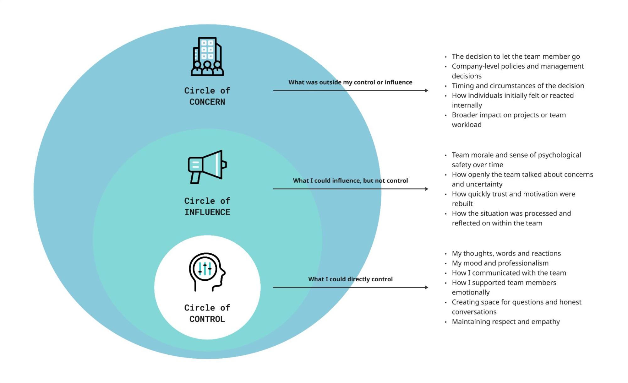 - The inner circle represents things that were fully mine to own: my reactions to the news, my communication to the team members, and the emotional tone I set for the team.