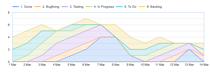 - Not identifying the bottlenecks – Connected to the above mentioned, not identifying (and addressing) bottlenecks in the process can make your delivery slower. Cumulative Flow Diagram (CFD) is a useful tool for visualizing and spotting bottlenecks. In the below example, Cumulative Flow Diagram shows widening of bands that represent Testing, Bugfixing and Done phases between March 4th and March 7th. This can indicate that there is a bottleneck in the testing phase.