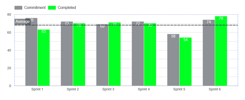 Example of velocity chart comparing commitment and completed story points across 6 sprints. Source: Author