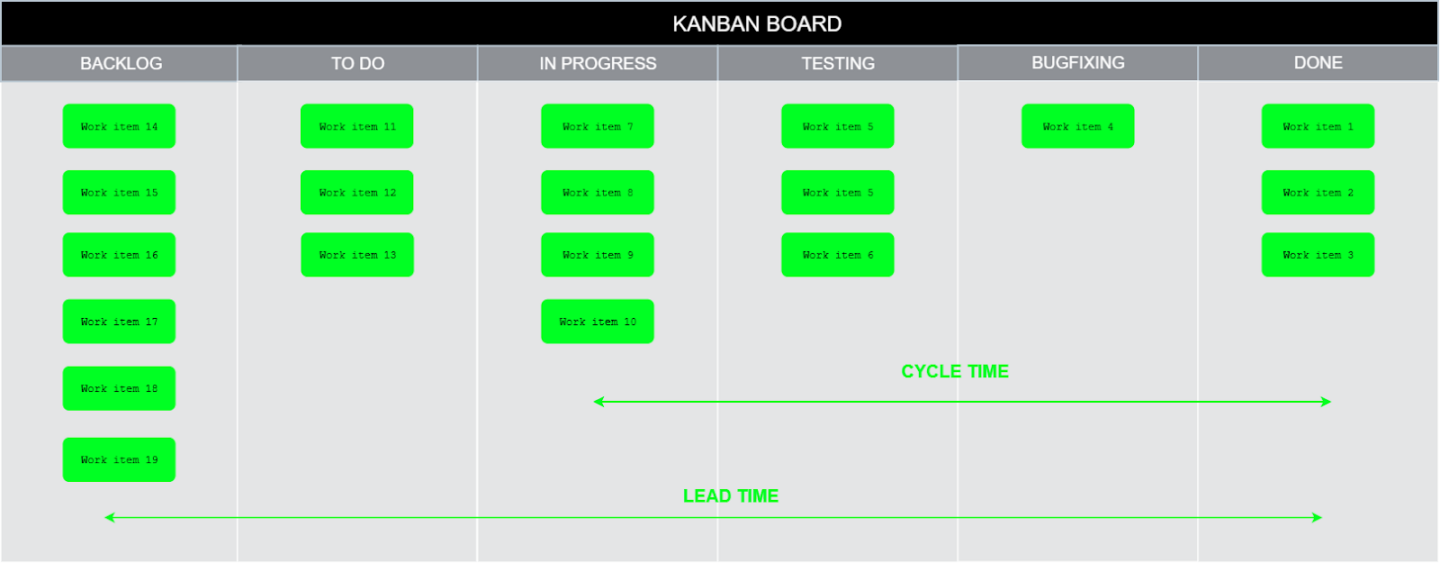 Kanban board showing the difference between lead time and cycle time. Source: Author