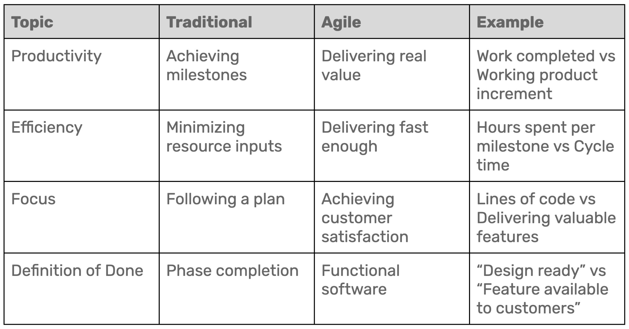 However, in Agile projects delivery of value (in the form of working software) represents a more important metric. Below you can find a table that shows the most important differences in measuring productivity between traditional and Agile projects.