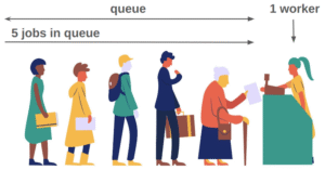 A worker has to process each person (job), and order of processing jobs is performed as first in first out (FIFO). So if you take a look at image 1, the old lady is processed first, and the young lady last.