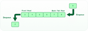 The element which is first pushed into order (image 2 – item with value 2), gets operation first performed on. (geeksforgeeks.org)