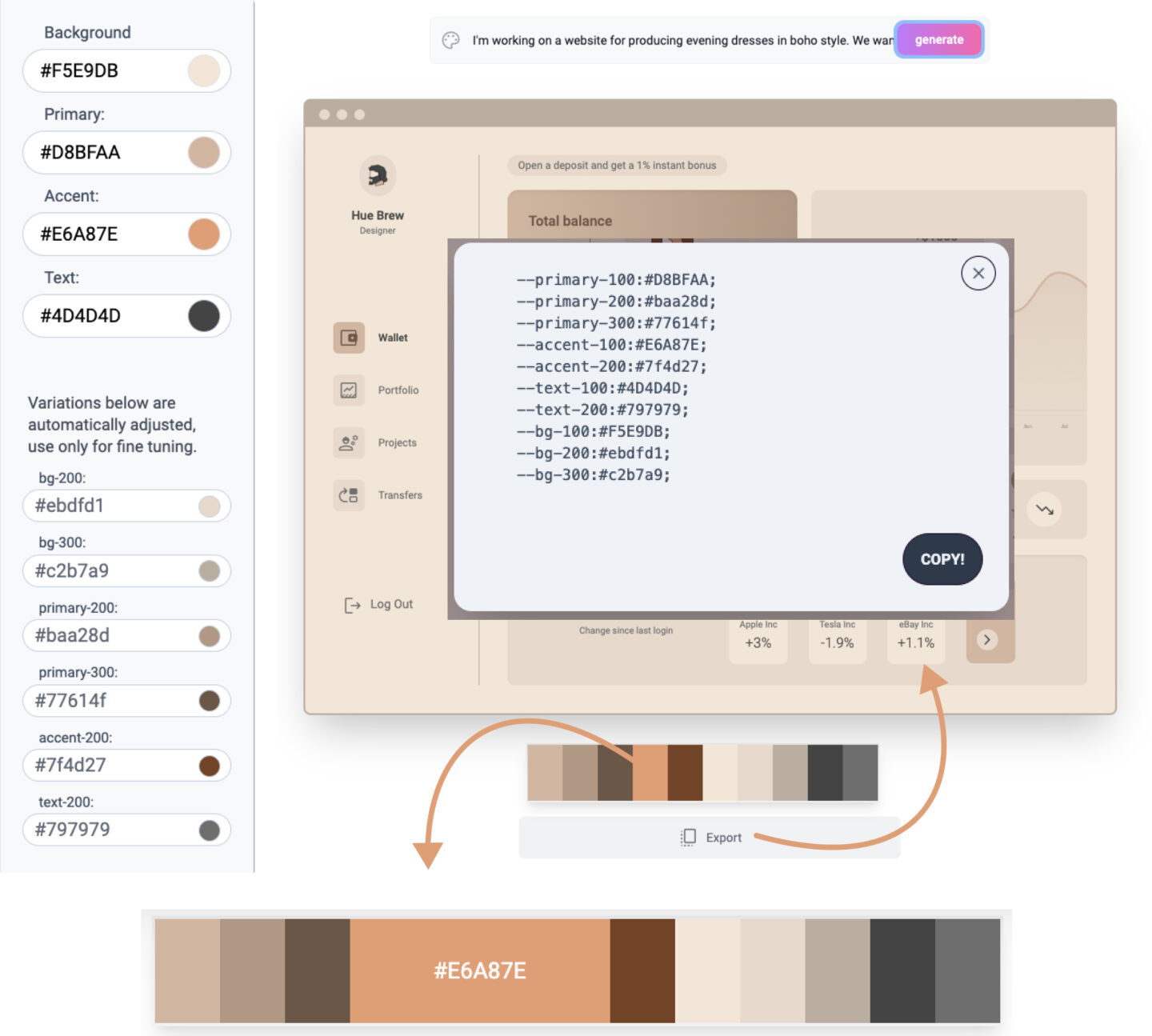 The generator has generated a 10-color palette in hexadecimal format that we can export.