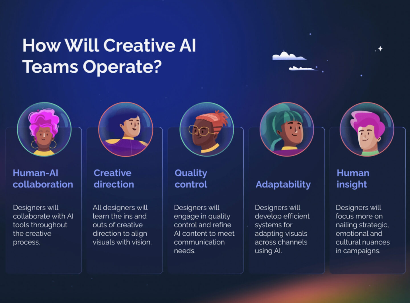 Once teams overcome the hurdle of adopting AI into design workflows, the new normal will be human-AI collaboration. Designers will collaborate with AI tools throughout the creative process, while balancing this tech with a human touch and irreplicable creativity.