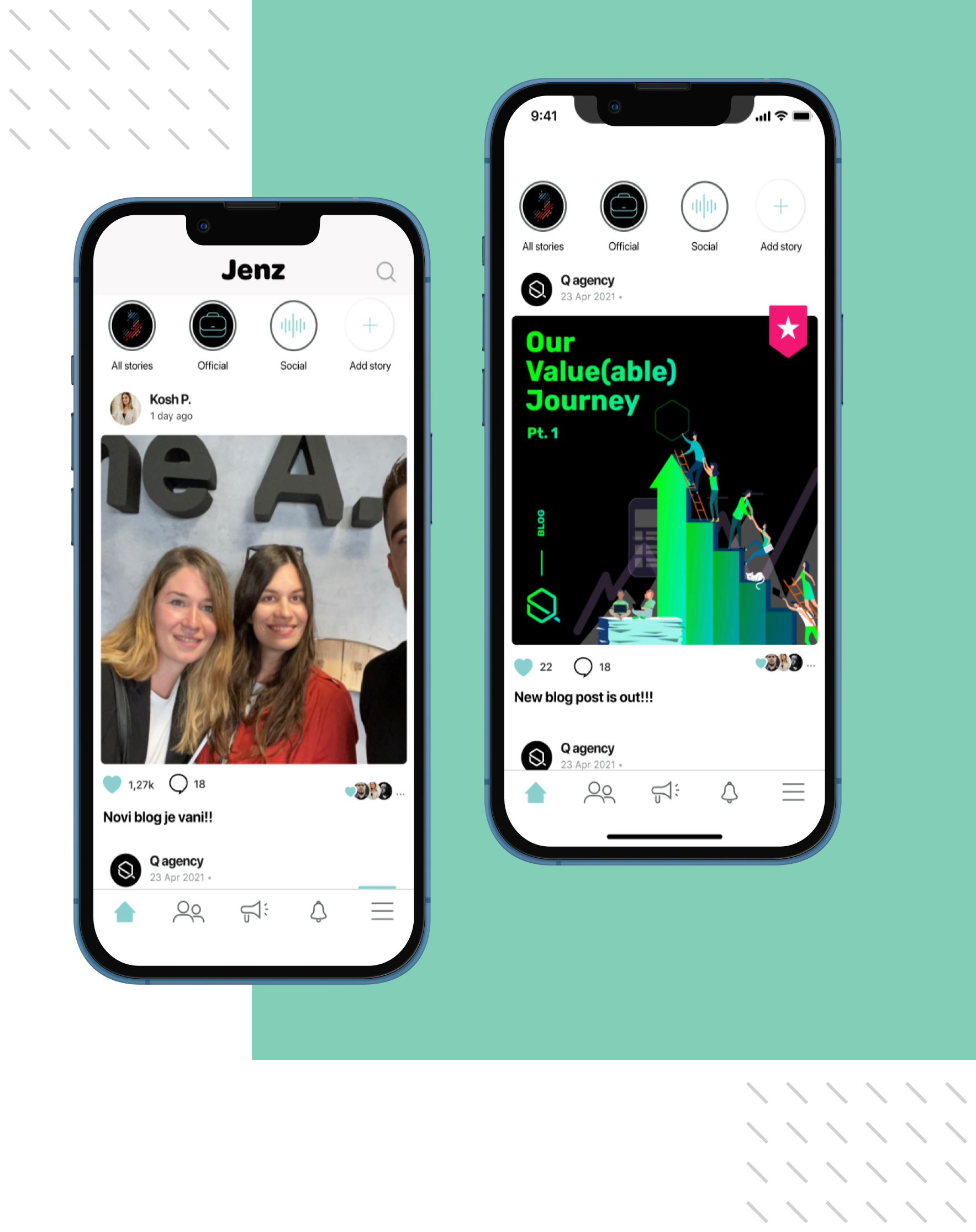 Jenz is a mobile app developed and verified by Q. Serving as an internal social network, it functions as the company’s live newsletter and intranet. Jenz unites people, fosters engagement, and encourages communication and feedback. It is an ideal solution for today’s remote work model, enhancing company culture and strengthening the workforce community.